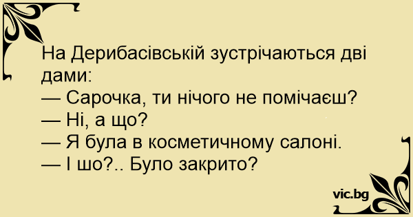 Зустрічаються дві подруги. — Привіт, ти де була? — Ходила до салону краси. — Ну і що, він закритий був?