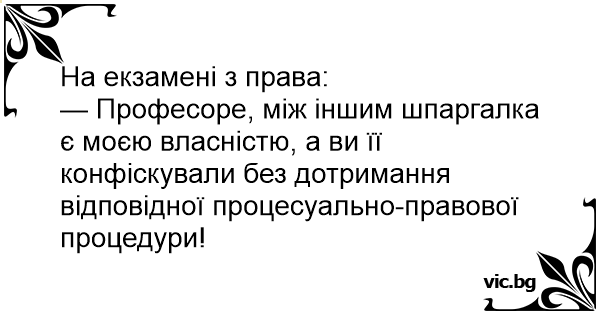 — Професоре, між іншим шпаргалка є моєю власністю, а ви її конфіскували без дотримання відповідної процесуально-правової процедури!