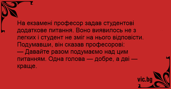 На екзамені професор задав студентові додаткове питання. Воно виявилось не з легких і студент не зміг на нього відповісти. Подумавши, він сказав професорові: