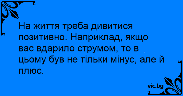 На життя треба дивитися позитивно. Наприклад, якщо вас вдарило струмом, то в цьому був не тільки мінус, але й плюс.