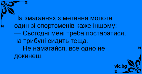 На състезанията по хвърляне на чук един спортист казва на приятеля си: - Днес трябва да дам всичко от себе си. На трибуната е жена ми. - Няма смисъл да се напъваш. Толкова далеч е невъзможно да...