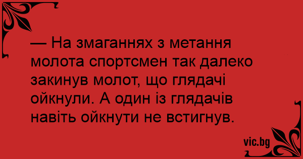 — На змаганнях з метання молота спортсмен так далеко закинув молот, що глядачі ойкнули. А один із глядачів навіть ойкнути не встигнув.