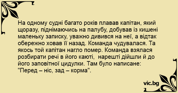На одному судні багато років плавав капітан, який щоразу, піднімаючись на палубу, добував із кишені маленьку записку, уважно дивився на неї, а відтак обережно ховав її назад. Команда чудувалася. Та якось той капітан нагло помер. Команда взялася розбирати речі в його каюті, нарешті дійшли й до його заповітної цидулки. Там було написане: