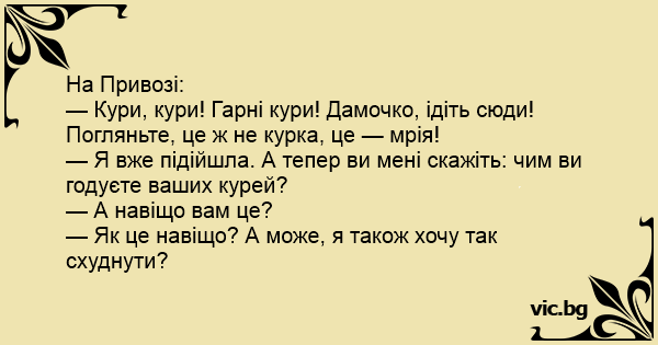 — Я вже підійшла. А тепер ви мені скажіть: чим ви годуєте ваших курей?