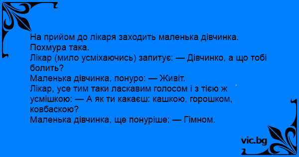 Лікар (мило усміхаючись) запитує: — Дівчинко, а що тобі болить?