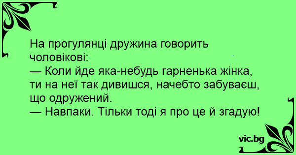 A férj és a feleség sétálgatnak az utcán... A férj egy csinos nő után néz, a feleség rászól: - Én komolyan nem értelek téged. Amint egy csinos nőt látsz, rögtön megfeledkezel arról, hogy nős vagy....