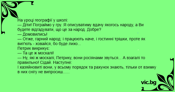 — Ну, які ж москалі, Петрику, вони росіянами звуться... А взагалі то правильно! Сідай. Наступне: