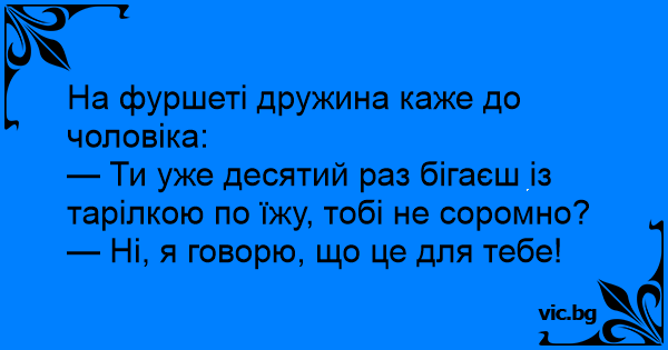 — Ти уже десятий раз бігаєш із тарілкою по їжу, тобі не соромно?