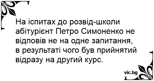 На іспитах до розвід-школи абітурієнт Петро Симоненко не відповів не на одне запитання, в результаті чого був прийнятий відразу на другий курс.