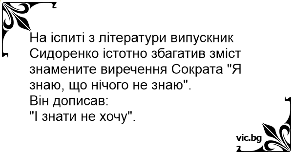 На іспиті з літератури випускник Сидоренко істотно збагатив зміст знамените виречення Сократа "Я знаю, що нічого не знаю".