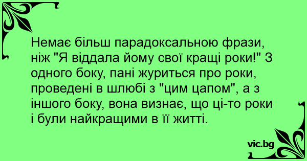 Немає більш парадоксальною фрази, ніж "Я віддала йому свої кращі роки!" З одного боку, пані журиться про роки, проведені в шлюбі з "цим цапом", а з іншого боку, вона визнає, що ці-то роки і були найкращими в її житті.