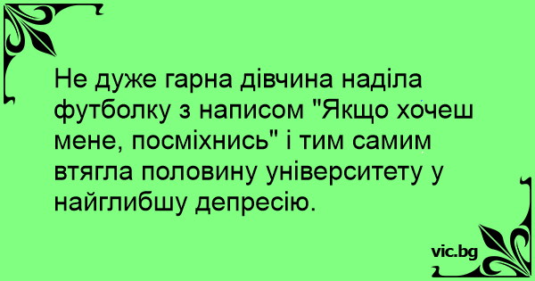 Не дуже гарна дівчина наділа футболку з написом "Якщо хочеш мене, посміхнись" і тим самим втягла половину університету у найглибшу депресію.