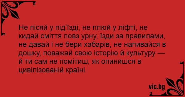 Не пісяй у під’їзді, не плюй у ліфті, не кидай сміття повз урну, їзди за правилами, не давай і не бери хабарів, не напивайся в дошку, поважай свою історію й культуру — й ти сам не помітиш, як опинишся в цивілізованій країні.
