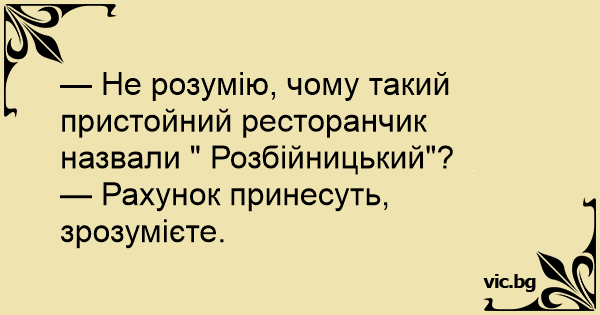 - Извинете келнер! Не разбирам, защо толкова приятен ресторант се казва "Разбойниците"? - Когато ви донеса сметката ще разберете!