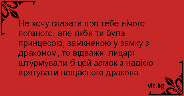 Не хочу сказати про тебе нічого поганого, але якби ти була принцесою, замкненою у замку з драконом, то відважні лицарі штурмували б цей замок з надією врятувати нещасного дракона.