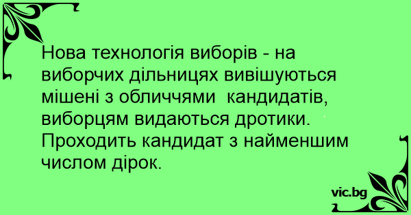 Нова технологія виборів - на виборчих дільницях вивішуються мішені з обличчями кандидатів, виборцям видаються дротики. Проходить кандидат з найменшим числом дірок.