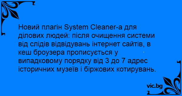Новий плагін System Cleaner-а для ділових людей: після очищення системи від слідів відвідувань інтернет сайтів, в кеш броузера прописується у випадковому порядку від 3 до 7 адрес історичних музеїв і біржових котирувань.