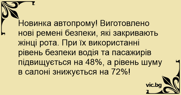 Новинка автопрому! Виготовлено нові ремені безпеки, які закривають жінці рота. При їх використанні рівень безпеки водія та пасажирів підвищується на 48%, а рівень шуму в салоні знижується на 72%!