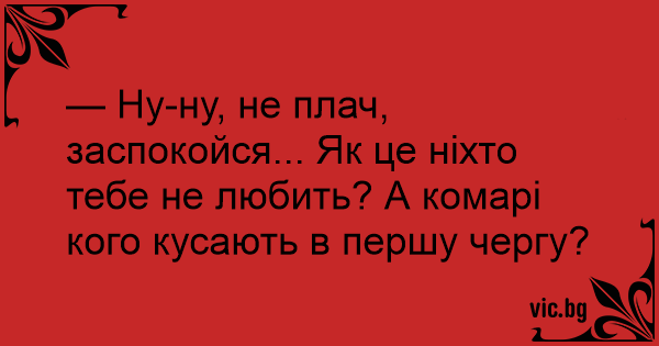 — Ну-ну, не плач, заспокойся... Як це ніхто тебе не любить? А комарі кого кусають в першу чергу?
