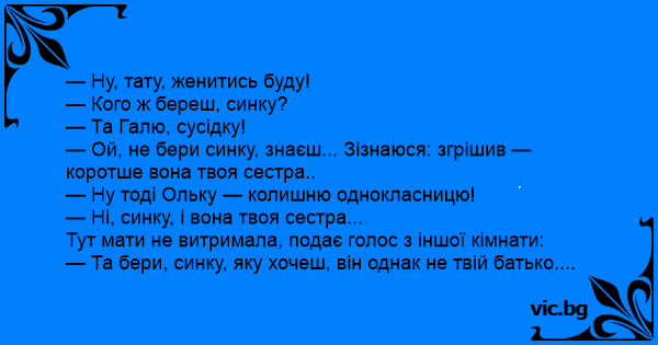 — Та бери, синку, яку хочеш, він однак не твій батько....