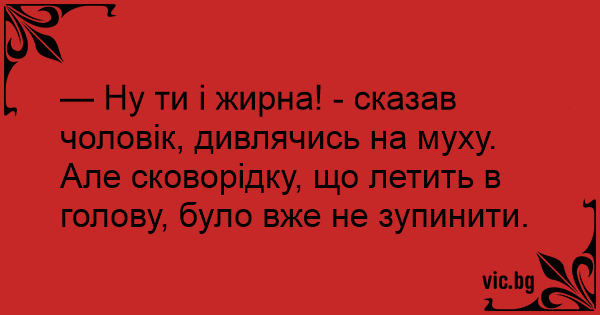 — Ну ти і жирна! - сказав чоловік, дивлячись на муху. Але сковорідку, що летить в голову, було вже не зупинити.