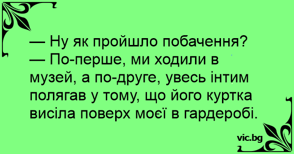 — По-перше, ми ходили в музей, а по-друге, увесь інтим полягав у тому, що його куртка висіла поверх моєї в гардеробі.