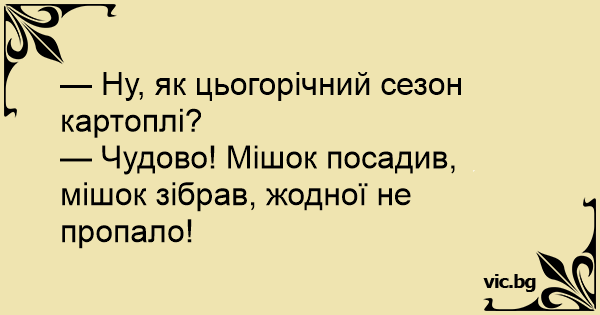 — Чудово! Мішок посадив, мішок зібрав, жодної не пропало!