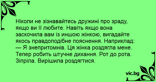 Ніколи не зізнавайтесь дружині про зраду, якщо ви її любите. Навіть якщо вона заскочила вам із иншою жінкою, вигадайте якось правдоподібне пояснення. Наприклад: — Я знепритомнів. Ця жінка роздягла мене. Тепер робить штучне дихання. Рот до рота. Зіпріла. Вирішила роздягтися.