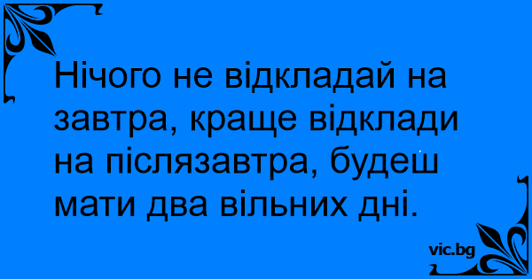 Нічого не відкладай на завтра, краще відклади на післязавтра, будеш мати два вільних дні.