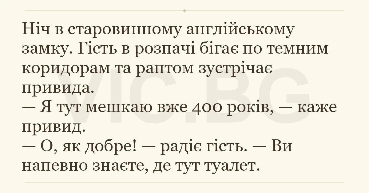 Ніч в старовинному англійському замку. Гість в розпачі бігає по темним коридорам та раптом зустрічає привида. — Я тут мешкаю вже 400 років, — каже привид. — О, як добре! — радіє гість. — Ви напевно знаєте, де тут туалет.