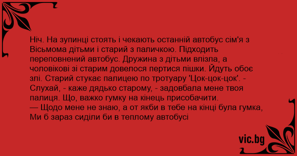 Вісьмома дітьми і старий з паличкою. Підходить переповнений автобус. Дружина з дітьми влізла, а чоловікові зі старим довелося пертися пішки. Йдуть обоє злі. Старий стукає палицею по тротуару 'Цок-цок-цок'. - Слухай, - каже дядько старому, - задовбала мене твоя палиця. Що, важко гумку на кінець присобачити.