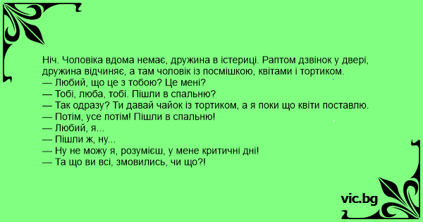 Ніч. Чоловіка вдома немає, дружина в істериці. Раптом дзвінок у двері, дружина відчиняє, а там чоловік із посмішкою, квітами і тортиком.