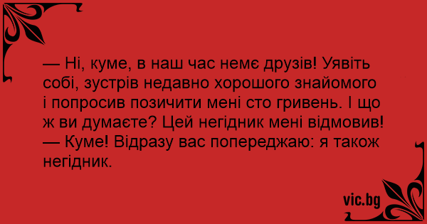 — Ні, куме, в наш час немє друзів! Уявіть собі, зустрів недавно хорошого знайомого і попросив позичити мені сто гривень. І що ж ви думаєте? Цей негідник мені відмовив!