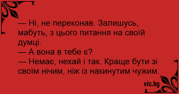 — Ні, не переконав. Залишусь, мабуть, з цього питання на своїй думці.