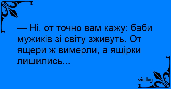 — Ні, от точно вам кажу: баби мужиків зі світу зживуть. От ящери ж вимерли, а ящірки лишились...