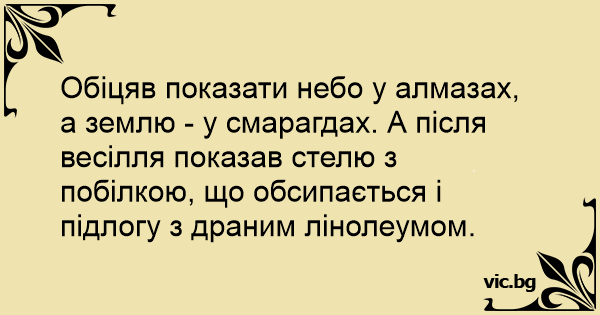 Обіцяв показати небо у алмазах, а землю - у смарагдах. А після весілля показав стелю з побілкою, що обсипається і підлогу з драним лінолеумом.