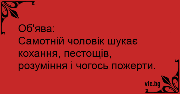 Самотній чоловік шукає кохання, пестощів, розуміння і чогось пожерти.