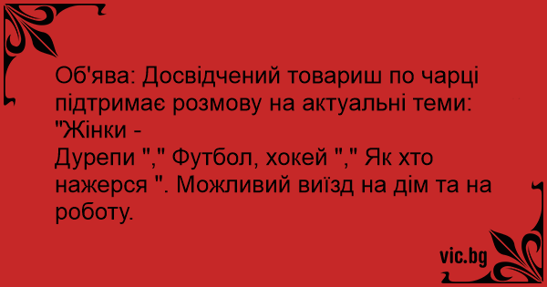 Об'ява: Досвідчений товариш по чарці підтримає розмову на актуальні теми: