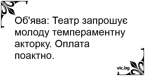 Об'ява: Театр запрошує молоду темпераментну акторку. Оплата поактно.