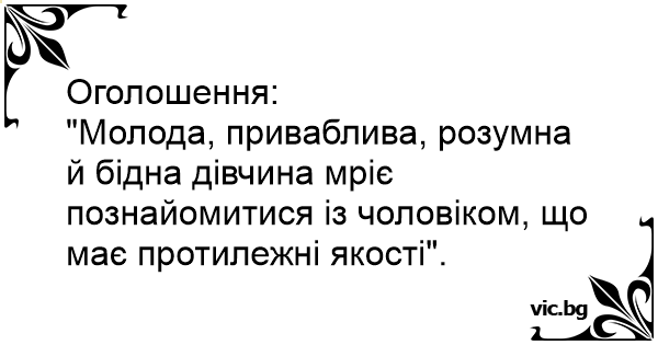 "Молода, приваблива, розумна й бідна дівчина мріє познайомитися із чоловіком, що має протилежні якості".