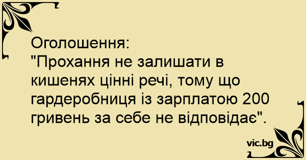 "Прохання не залишати в кишенях цінні речі, тому що гардеробниця із зарплатою 200 гривень за себе не відповідає".