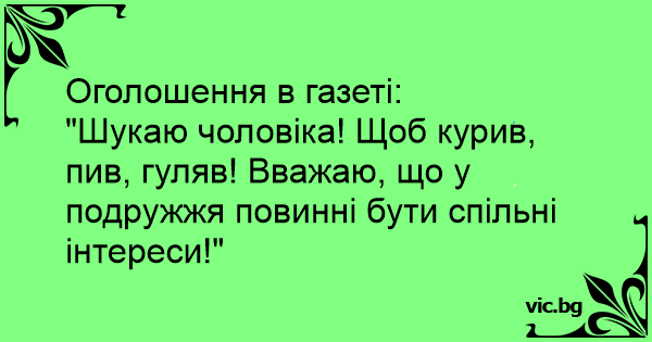 "Шукаю чоловіка! Щоб курив, пив, гуляв! Вважаю, що у подружжя повинні бути спільні інтереси!"