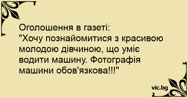 Оголошення в газеті:<br />"Хочу познайомитися з красивою молодою дівчиною, що уміє водити машину. Фотографія машини обов'язкова!!!"