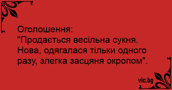 "Продається весільна сукня. Нова, одягалася тільки одного разу, злегка засцяня окропом".