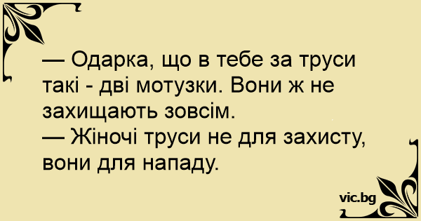 — Одарка, що в тебе за труси такі - дві мотузки. Вони ж не захищають зовсім.