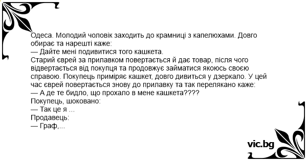 Одеса. Молодий чоловік заходить до крамниці з капелюхами. Довго обирає та нарешті каже: