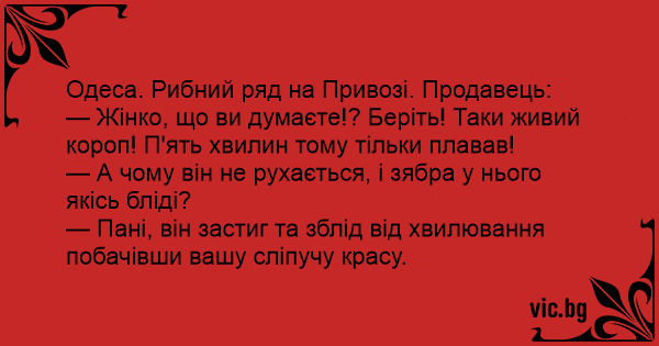 — Жінко, що ви думаєте!? Беріть! Таки живий короп! П'ять хвилин тому тільки плавав!