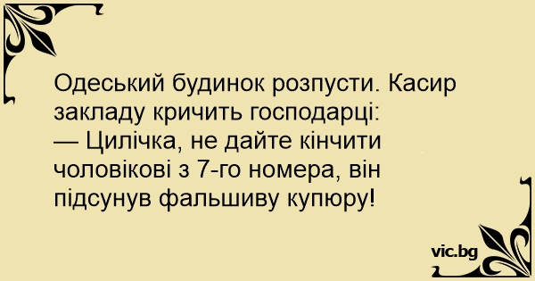 — Цилічка, не дайте кінчити чоловікові з 7-го номера, він підсунув фальшиву купюру!