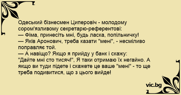 — Яків Аронович, треба казати "мені", - несміливо поправляє той.
