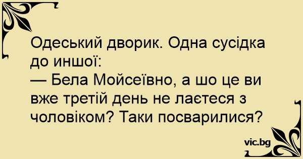 — Бела Мойсеївно, а шо це ви вже третій день не лаєтеся з чоловіком? Таки посварилися?
